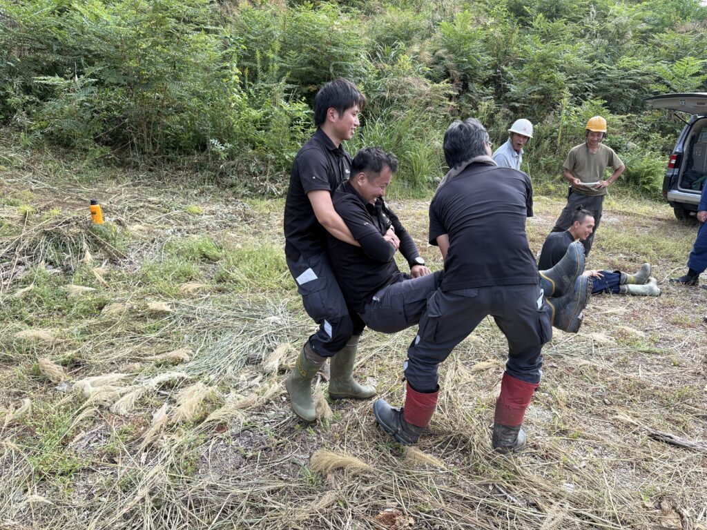 色々な搬送方法を教えていただきましたが、傷病者はできる限りその場が動かさないのが原則です。特に林業現場では、傾斜があるため、運ぼうとした時に滑り、別の人が怪我や傷病者への負担増につながります。消防隊の方の指示を仰ぎながら、無茶な搬送は避けるようにすることが大切です。