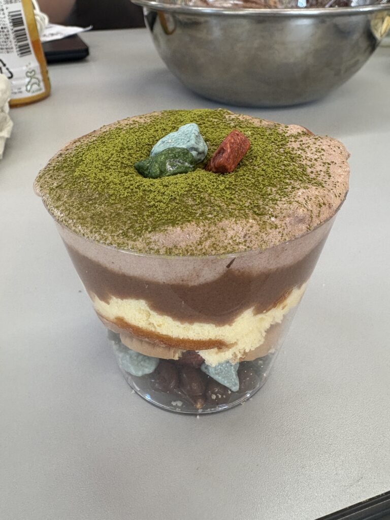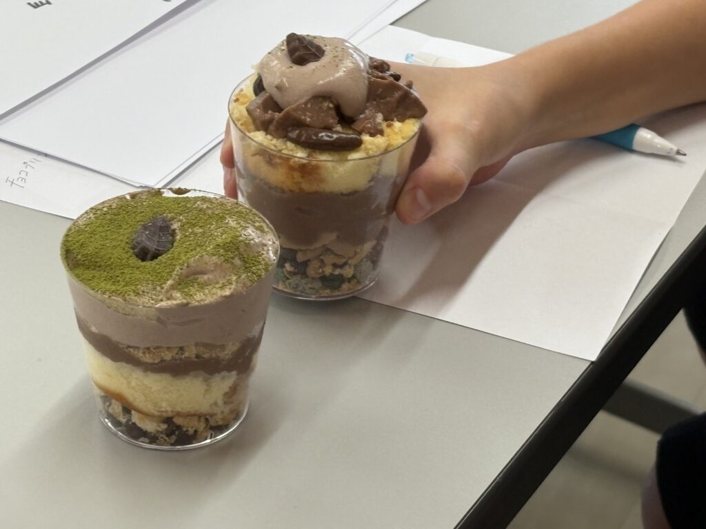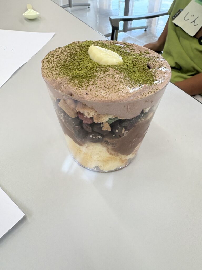 試行錯誤しながら順番に材料を入れて、層を作っていきました。1番の層には、ココア生クリームを被せ、植物に見立てた抹茶パウダーをかけて完成です。