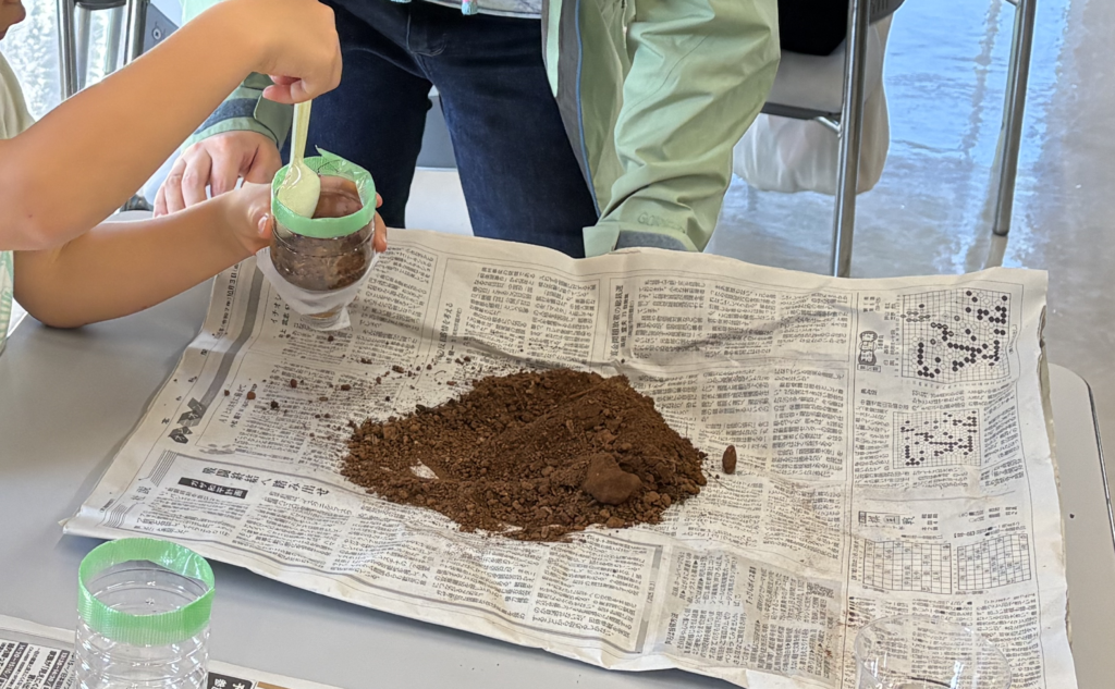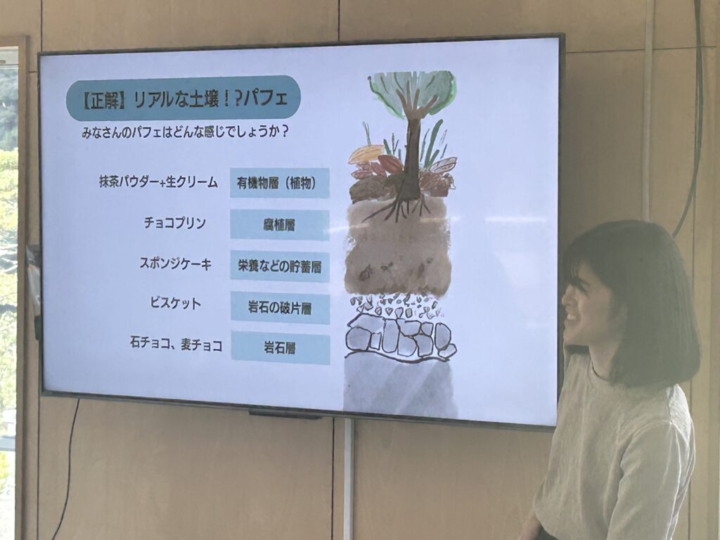 私たちの身の回りにある道にも森にも畑にも「つち」があります。そんな身近にある「つち」の成り立ちや特徴、森や気候との関係性を美味しい土スイーツ作りを通して、学びました。
