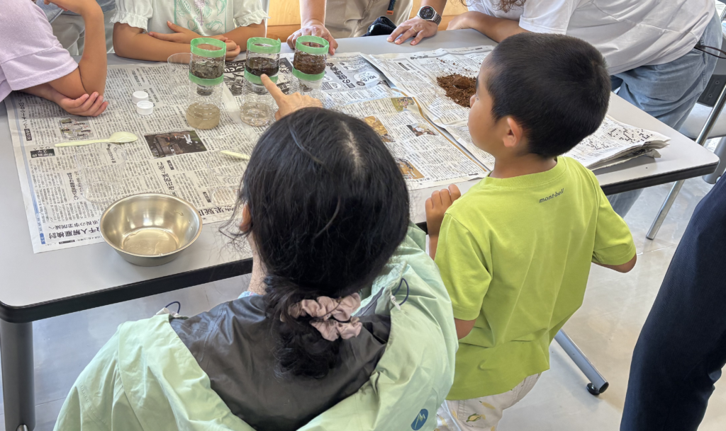 今回の実験は、持ち帰った土をペットボトルに入れてその上から水を注ぎ、下に出てくる水の量を確認します。出てくる水の量が少ないほど土が水を保持しているということがわかります。みんなで粒の大きな土、粒の小さな土、小石の3つのペットボトルを作り、上から水を注ぎました。小石からは多くの水が下に出てきたのに対し、土からは水はあまり出てきません。土の保水性が目に見えて分かりました。他にも、小石から出てきた水は濁っているのに対して、土の方から出てきた水は透明度がありました。これには、子どもたちもなぜだろうと不思議そうな顔です。土は小石に比べて隙間が狭く、濁りにつながる物質が通れないことが推察できます。