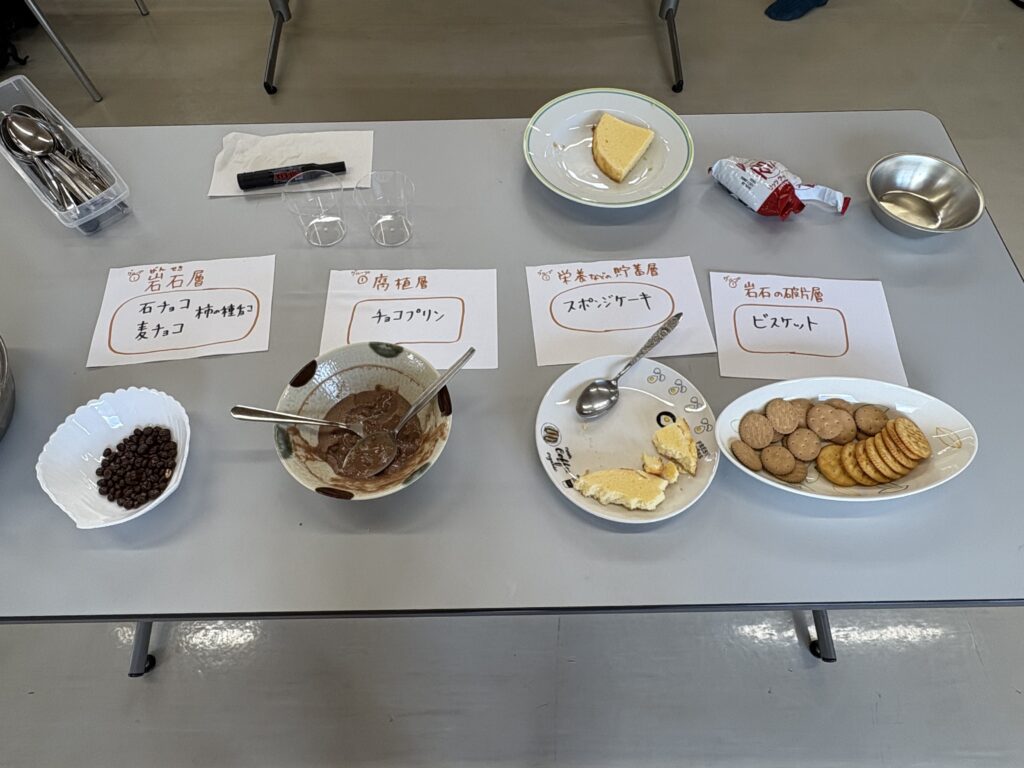 「つち」についてよくわかるようになったところで、パフェ作りを通して土がどのような順番の層でできているのかを考えました。用意された材料それぞれを石チョコ・麦チョコで岩石層を、チョコプリンで腐植層を、栄養などの貯蓄層でスポンジケーキを、ビスケットで岩石の破片層に見立てて表現します。