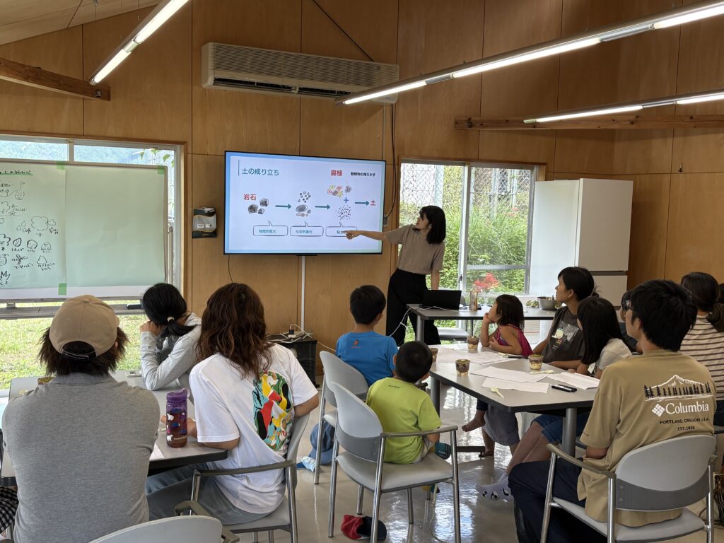 坂口さんからの「森と土ってどうつながっているの?」や「土ってどうやってできるんだろう?」という問いかけに対し、グループごとでアイデアを出し合いました。お父さん・お母さんや基金の職員もサポートに入りながら、子どもたちとアイデアを共有します。グループ間でも出たアイデアの共有を行い、みんなで「つち」について知ることができました。