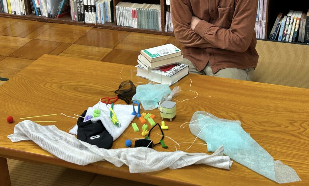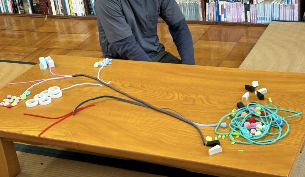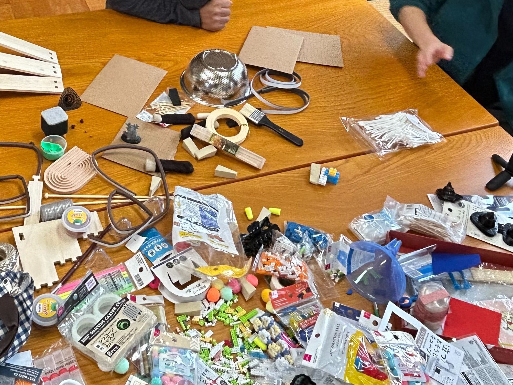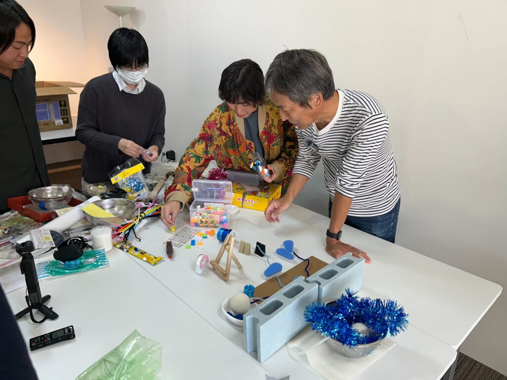 やり方は嶺北編と全く同じ。参加者との対話形式による森林とのかかわりに対する言語化セッションと膨大な100均グッズによるイメージの物理的な再構築セッションです。参加者は主催者側の問いかけに導かれるようにそれぞれの意識のどこかにある山や森に分け入りながら、おぼろげな子どもの頃の思い出や現在の仕事や活動に至った道のりなどを戸惑いながら時には嬉々として、少しずつ語りはじめます。頃合いをみてインタビュアーから「それを形にしてみませんか」と100均グッズの積みあがったテーブルを指さします。
