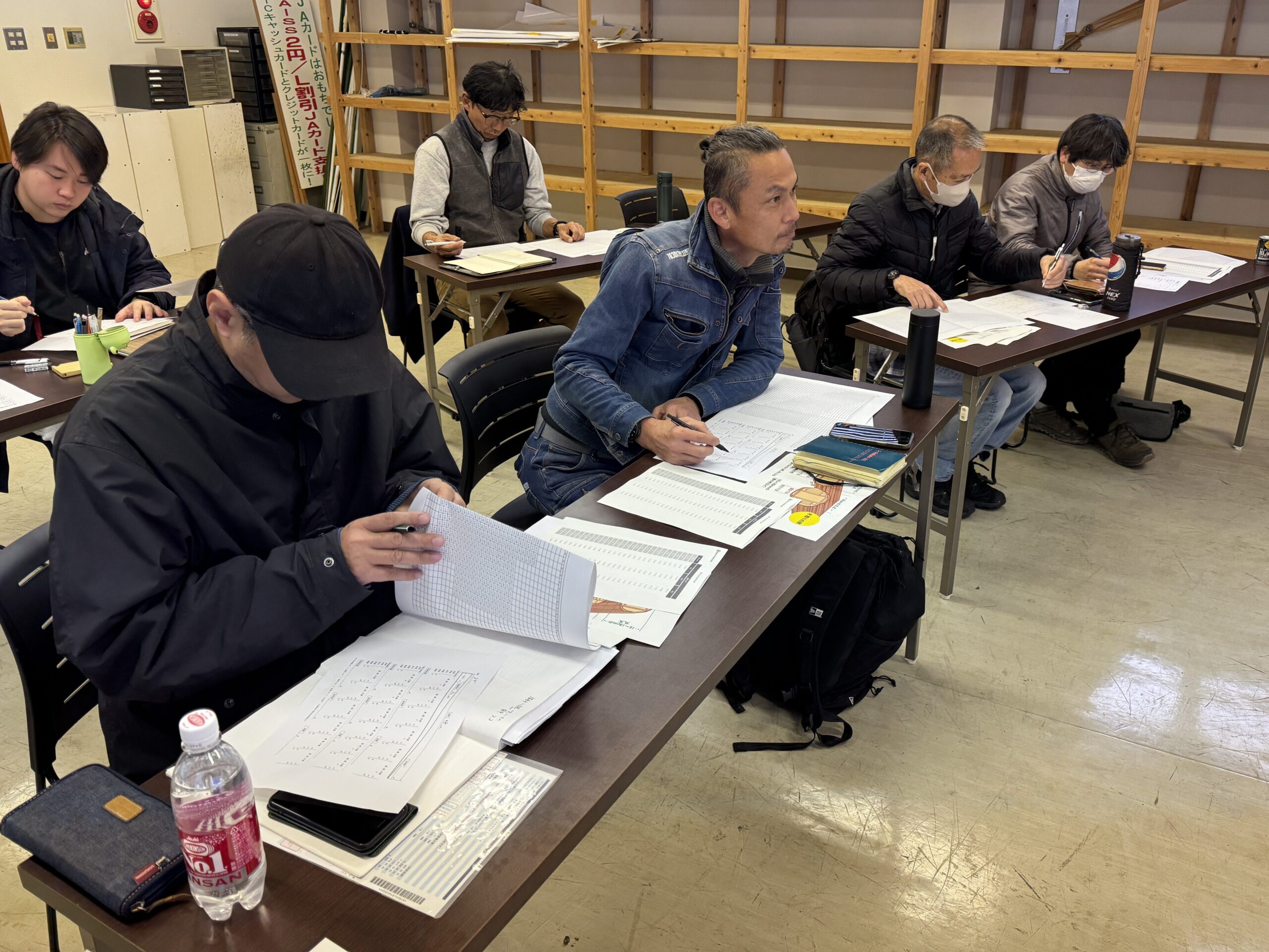 座学では木材市場の市況などを見ながら、造材の仕方による木1本の金額の変化などを確認しました。木材価格がどのように決まっているか、製材所はどんな品物が欲しいのかなどを知ることで、どこに情報を取りに行けばいいのかも理解できます。